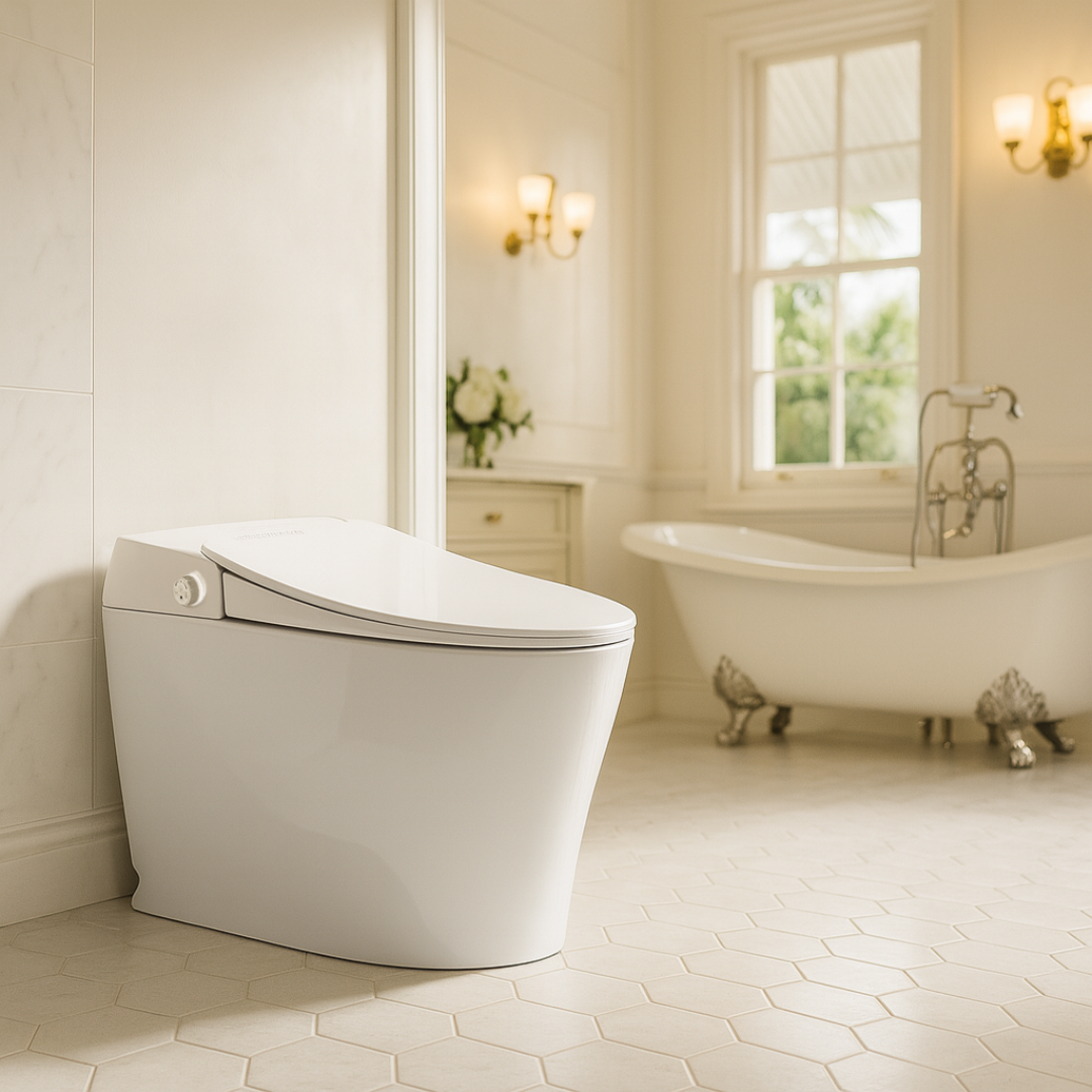 One-piece smart toilet with auto lid and flush, heated seat, custom wash and dry, UV self-clean, and quiet deodoriser. A first-class bathroom experience.